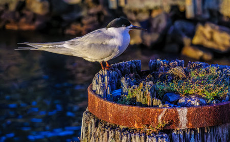 White-fronted term perched on top of old wharf pile that it will probably nest on soon on Tauranga harber, New Zealand.