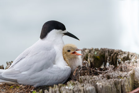 Adult white-fronted tern or strena striata on edge nest on pole top with baby bird or chick on Tauranga waterfront.