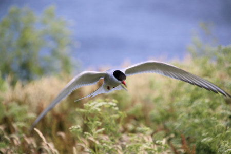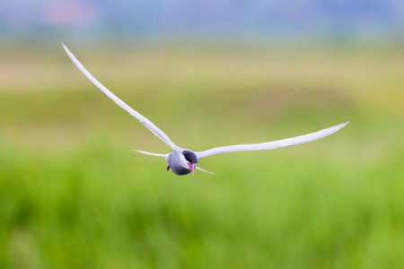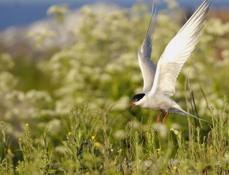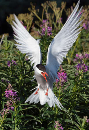 Fluttering turn. Common Tern with spreading wings in flight at sunny day. front view. Flowers Blooming Sally of on the background. adult bird. Scientific name: Sterna Hirundo.