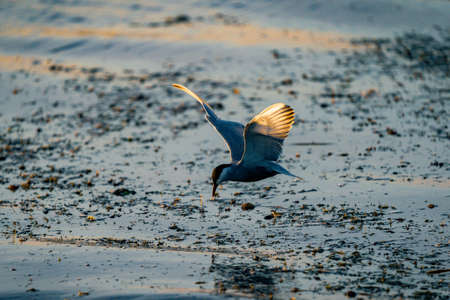 White-cheeked Tern fishing in Danube Delta, Romania. Tern in flight over water at sunrise