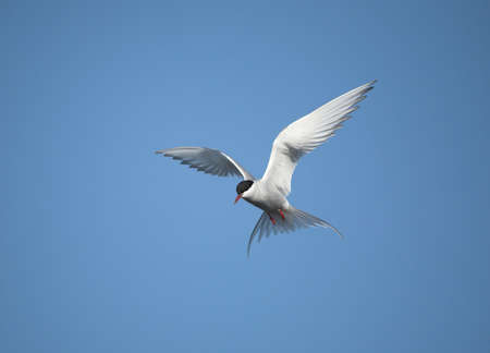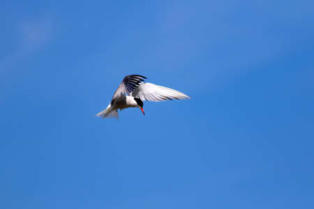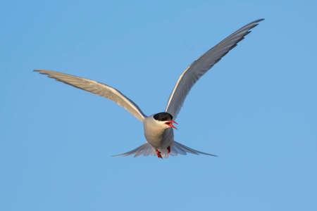 Adult common tern in flight on the blue sky background. Close up, front view. Scientific name: Sterna hirundo