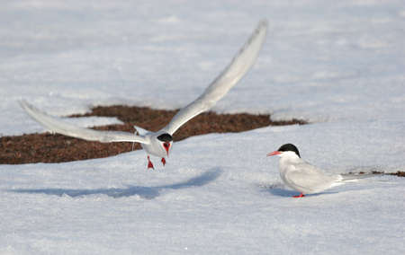 The Arctic tern (Sterna paradisaea) is a seabird of the tern family Sternidae. on snow in antarctic.