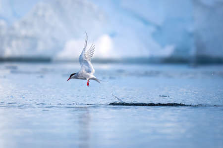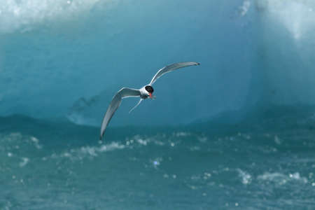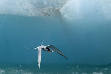 Close up Arctic Tern bird or Kria bird flying and catching fish from the sea in summer of Iceland