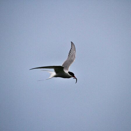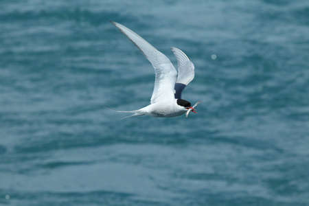 Arctic tern, Sterna paradisaea, in flight with a fish in the beak.