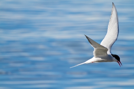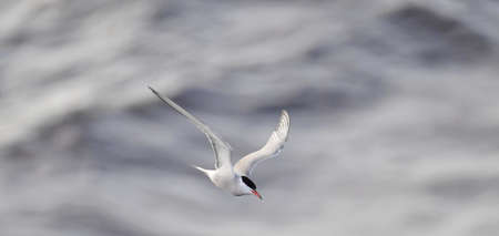 A tern in flight. Blue sea waves in the background. top view. Adult common tern in flight. Scientific name: Sterna hirundo. Natural habitat, summer season. Ladoga Lake. Russia.