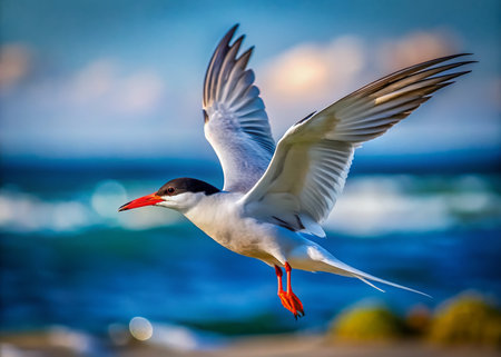 Common Tern Bird in Flight, Coastal Wildlife Photography, Ocean Background, Copy Space
