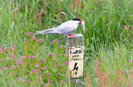 Arctic Tern (Sterna paradisaea) resting on the ground, large fish in it's beak, Iceland