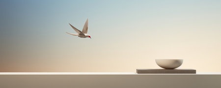 A Bird Flying Over A Cup On Top Of A Table. Сoncept Unexpected Uses For Everyday Objects, The Wonders Of Flight, Natures Artistry, The Mysteries Of Life.