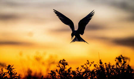 Silhouette of flying common tern. Flying common tern on the red sunset sky background. Scientific name: Sterna hirundo. natural environment. Russia. Ladoga Lake.