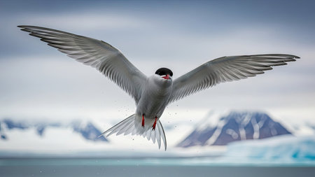 An arctic tern soars in mid-air with outstretched wings, showcasing its streamlined silhouette and gray plumage. The image displays a clear blue sky, icebergs, and distant snow-capped mountains. The photograph's composition and lighting could be suitable for nature-focused publications or travel-related visual content.