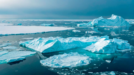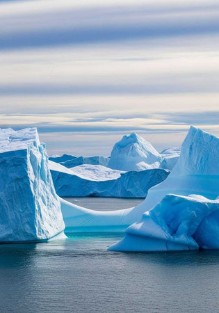 A serene landscape of icebergs floating in the ocean under a cloudy sky