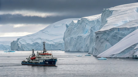 A red icebreaker ship cuts through icy polar waters, surrounded by majestic glaciers under clear, crisp skies in a remote landscape. Generative AI