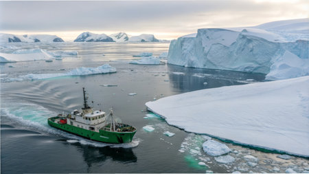 Green ship navigating icebergs in majestic antarctic seascape.