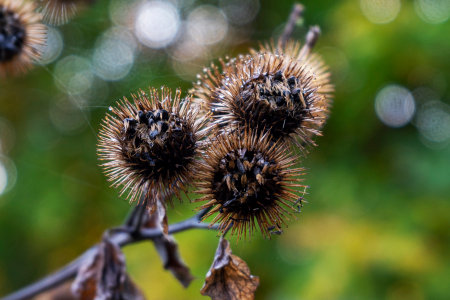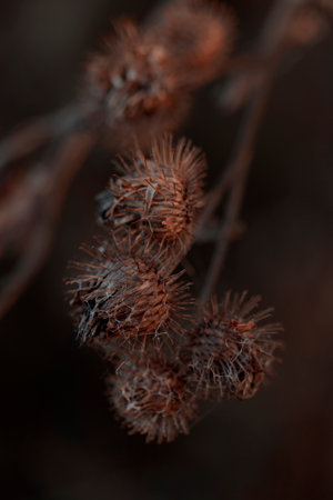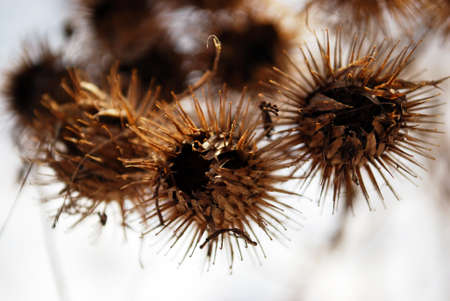 Prickly burdock seed baskets in close up in winter time natrural wild environmental.