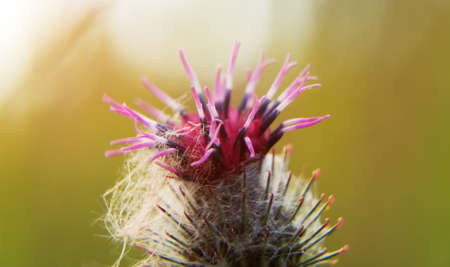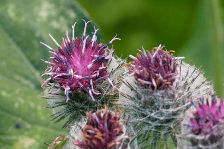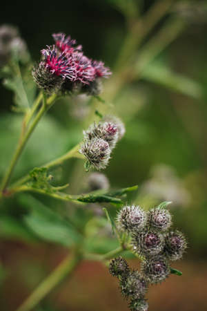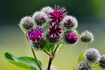 Close-up of pink burdock flowers blossoms on green blurred background.