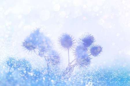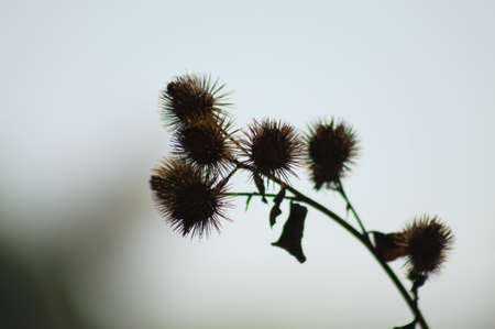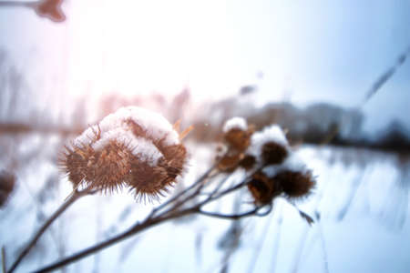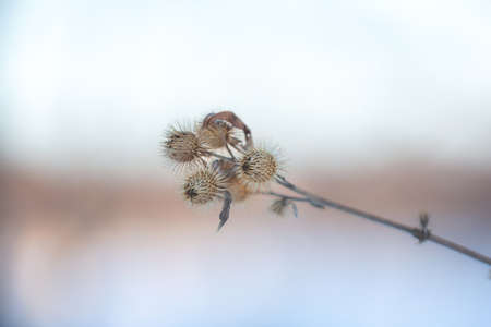 Close-up image of Old Dry burdock at sunset in winter. Natural background