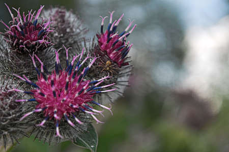 Greater burdock purple prickly flowers. Arctium lappa L plant.