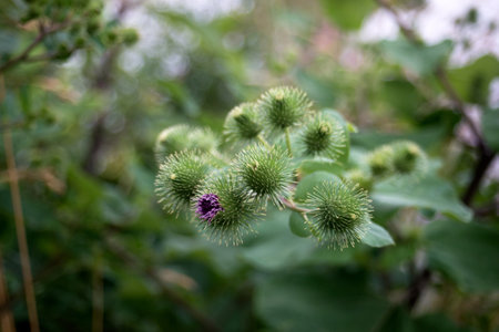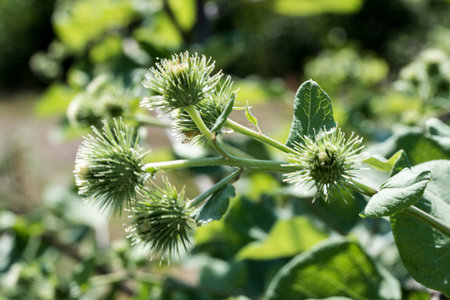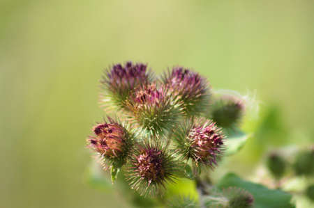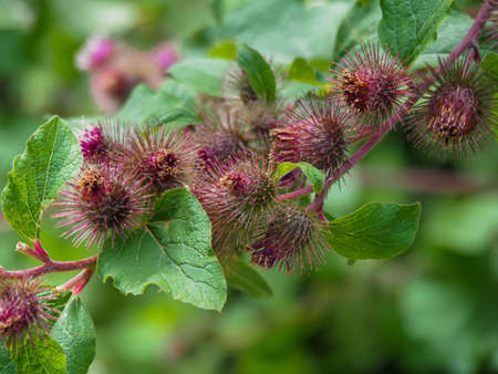 Multi lesser burdock buds close-up view with selective focus on foreground
