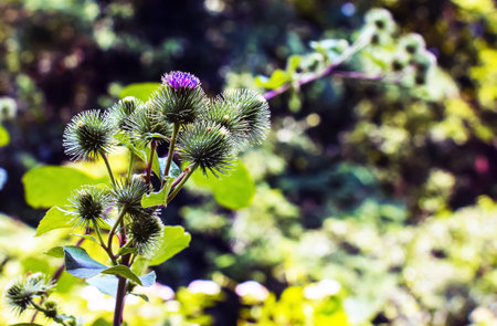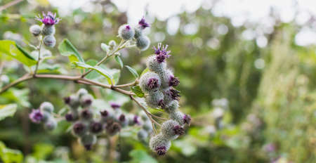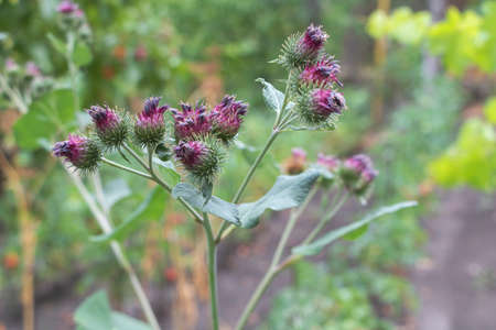 Burdock purple flower in herbal garden. Medicinal plant of the Arctium lappa, greater burdock, edible burdock, beggar's buttons, thorny burr, happy major.