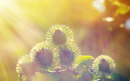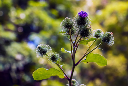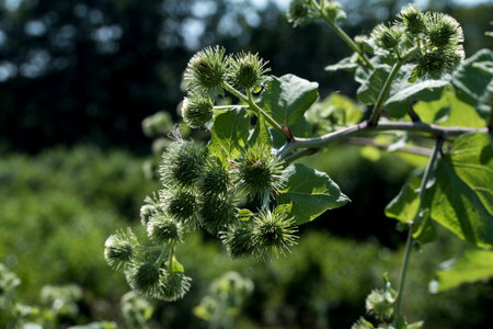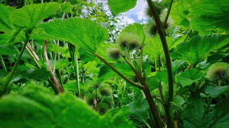 The Burdock root in summer, Bright sunlight pierces dense foliage, the air feels hot, natural color