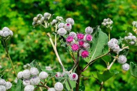 Arctium lappa commonly called greater burdock. Blooming burdock flowers on natural plant background