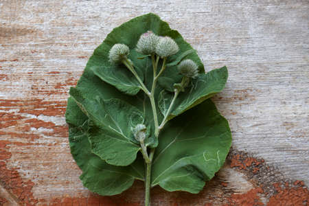 Burdock or Arctium plant with blooming flowers and big juicy leaves growing in the forest