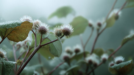 The Burdock in light fog, dew on leaves, light soft diffused, three-quarter view