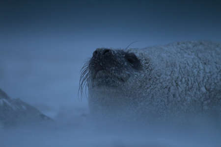 Gray Seal (Halichoerus grypus) pup in winter, snowstorm, Helgoland