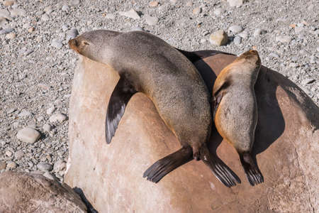 closeup of a New Zealand fur seal cow with pup resting on a big boulder at Kaikoura beach