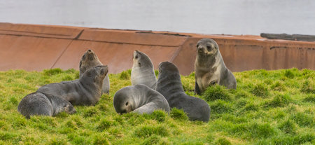 A group of young antarctic fur seals / antarctic fur seals (Arctocephalus gazella) lie in their natural environment in the green tussock grass in South Georgia