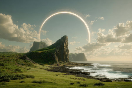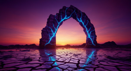 An ethereal scene displays a glowing arch over a calm body of water, reflecting the form in a mirrored image. The composition features a gradient sky with warm and cool colors. The artwork suggests a serene, futuristic setting suitable for conceptual projects or artistic illustrations.