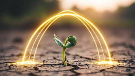 Green seedling growing on cracked soil with light effect. Ecology concept
