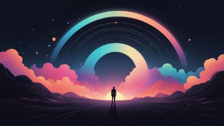 Silhouette of a man standing in front of a colorful rainbow in the sky.