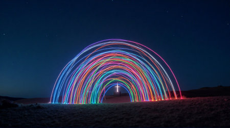 Vibrant neon light trails create a stunning rainbow arch over a serene landscape with a glowing cross.