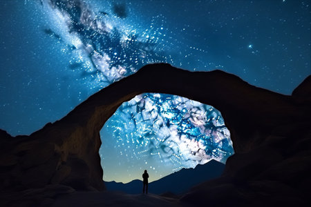 In the image, a solitary figure stands on a grassy landscape under a night sky illuminated by a mesmerizing, swirling vortex of light. The vortex exhibits vibrant hues of blue, purple, and white, creating a striking contrast against the dark sky and the silhouette of the observer. The scene evokes a sense of wonder and contemplation, as if the individual is witnessing a cosmic phenomenon or the edge of a black hole. The stars twinkle subtly in the background, enhancing the ethereal and otherworldly atmosphere of the scene.