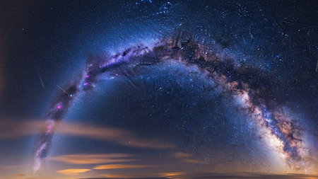The arc of the Milky Way galaxy dominates the night sky, a display of cosmic dust and stars. Swirls of purple and blue hues are visible within the galactic arm, contrasting with the deep blackness of space. Countless stars twinkle in the background, and faint clouds drift near the horizon. Streaks of light, possibly meteors, add a dynamic to this awe-inspiring celestial panorama.