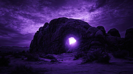A dark rock formation featuring an arch is dramatically lit against a vibrant purple sky. The image uses contrasting light and shadow to enhance the natural textures of the stone. This atmospheric composition suggests an outdoor environment, possibly for commercial or editorial use.