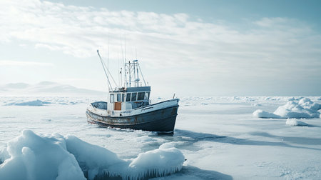 A vast, snow-covered Arctic landscape with unique ice formations and a clear blue sky, evoking a sense of serenity and natural beauty in a remote, frozen environment.