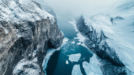 Icebergs drift gracefully in dark waters surrounded by stunning rocky landscapes. The scene captures a peaceful yet powerful display of natures raw beauty and icy formations.