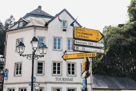 Vianden, Luxembourg - May 18, 2019: Directional signs on a road in Vianden, town in Luxembourgs Ardennes region known for the centuries-old hilltop Vianden Castle.