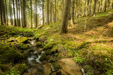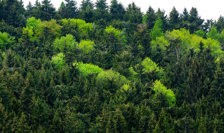 Healthy green trees in a forest of old spruce, ecosystem and healthy environment concepts and background