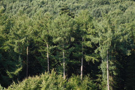 the photo is taken frontally. Ther's a forest of firs that create a texture of natural trees. The main colors are dark greens and browns