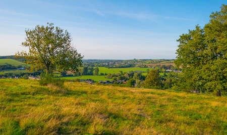 Fields and trees in a green hilly grassy landscape under a blue sky in sunlight at fall, Voeren, Limburg, Belgium, September 11, 2020