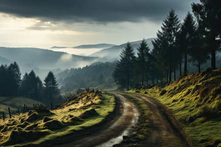 A narrow automobile paved intermountain road passes and meanders among low hills covered with spruce forests and meadow grass, against the background of an evening sunny cloudy sky