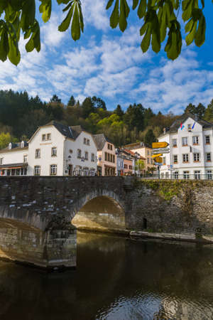 Vianden, Luxembourg - May 18, 2019: Fountains on the river Our in Vianden, a town in Luxembourgs Ardennes region known for the centuries-old hilltop Vianden Castle.