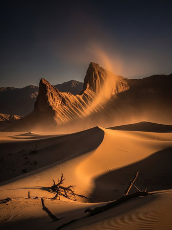 A desert landscape bathed in the warm glow of sunset, featuring sweeping sand dunes sculpted by the wind and dramatic, rugged rock formations in the distance.