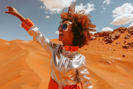 Fashionable African-American woman with afro hairstyle in the desert on mars.