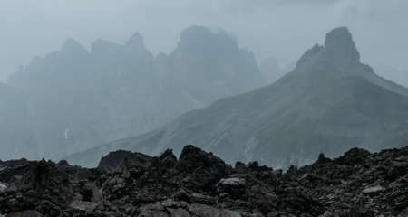 Early foggy and rainy morning shot of picturesque Dolomite Alps view near Tre Cime di Lavaredo formation in South Tyrol, Italy. Beauty in Nature and mountain concept.