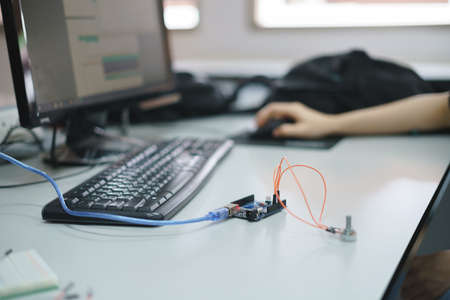 Electronic component connected with breadboard in laboratory. electrical engineering with cables and controller. Modern technologies, electronics, diy product engineering