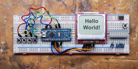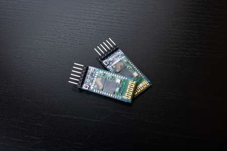 manual assembly of electronic microprocessor device. Set of spare part constructor. wood background. Helllo world.